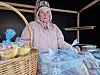 En av dem som stod för fikabröd och godsaker till julbordet var Eva. I år hade hon gjort 696 knäck och 400 bullar, och därutöver minipraliner som sålde bra bland besökarna. Eva säger att hon också, som vanligt, stickat produkter till förmån för hemlösa.