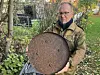 Jonas Toftén med fyndet som nu visat sig vara ett lock till en brittisk fallskärmsbehållare. Foto: Lars Gyllenhaal