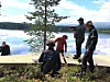 Byggnation av en bredare landgång pågår just nu i Häggsåsjön. På fotot syns Martin Liljedahl, Ludvig Hultgren, Johan Karlsson samt arbetsledarna Patrik Jonsson och Niklas Öst, alla från daglig verksamhet, Bergs kommun. Foto: Conny Elf