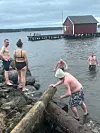 Istället för att som vanligt vid kallbad hoppa ner i en vak fick de badsugna ta sig ut från stranden. Foto: Magnus Eriksson.