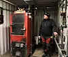 Mikael visar biogaspannan som fördelar värmen till ladugården och de två gårdarna.