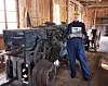 Eva Bredberg som har skrivit boken, här framför hyveln som gjorde sågverket unikt.