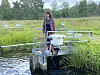 Mariana Backberg tittar ut över en av fiskdammarna. Hon är ny platschef vid Vattenbrukscentrum Norr.