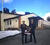 Birk Wikén t.v. och Gustav Mårtensson ska börja arrangera dans här på Ordenshuset i Brunflo. Första bandet blir Shine, vilket framgår av affischen. Foto: Privat