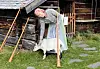 Åsa Okutani tar en paus från näverluren och klappar geten Solveig som är av rasen jämtget. ”Det är många som tror att det är olika raser eftersom de ser så olika ut” säger den andra butösen för dagen, Tilda Lindqvist.