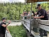 Roger Staaf tar upp en öring ur Robbert Scherpenborgs håv. Publiken följer med i händelserna med stort intresse.