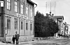 Johan Saxon med sonen Anders framför Jämtlands Tidnings lokal på Storgatan 39 cirka 1895. I bakgrunden telefonföreningens mast, ett tydligt tecken på teknikutvecklingen men täckningen för det lokala telefonnätet var ännu inte så omfattande. Foto: Föreningen Gamla Östersund, CC BY NC-4.0