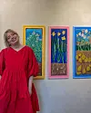 Jessica med tre av sina verk. Foto: Privat