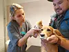 Danny håller hunden Selma medan veterinär Stephanie undersöker öronen för att ta reda på vad som orsakar hundens irritation och klåda.