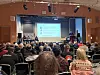 Fullsatt informationsmöte om litiumprojektet i Järkvissle. Från vänster på scenen: Rickard Sundkvist, projektledare miljöfrågor, Jyri Meriläinen, geolog och projektledare, Ove Göting, vice ordförande, Devendra Darda, VD. I talarstolen: Johan Morin, jurist och projektledare för tillståndsfrågor.