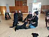I en cirkel sitter ett tiotal hussar och mattar, och i mitten ligger hundar i form av avslappnade på sidan. För någon hund är det lite för svårt att koppla av, så då får han träna på att vara avslappnad mellan mattes ben.