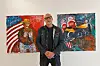 Gunnar Lindberg framför två av sina målningar från bikerkulturen.