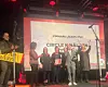 Från vinnarfirandet i Sälen den 30 november, med personalen från Ytterån. Jonas Winter längst till vänster. Vid mikrofonen Gabriel Hellman, som tillsammans med Andrea Skullman varit eventansvariga för denna resa.