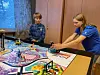 Axel Vikberg och Iris Lundin visar robotbanan.