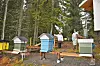 Maria Nexéus och Michael Källman vid några av sina björnsäkra bikupor i Önet.