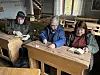 Som barn på nytt. Karl-Gunnar Huring läser i en minst hundra år gammal psalmbok, Lisbet Bryne testar griffeltavlan med en hartass som sudd, och Marianne Tengberg tittar igenom skolans bibel. Trion vill att Risselås gamla skola bevaras och används igen. Foto: Anna Westerberg