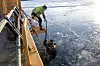 – Vi har dykare här som hjälper oss att laga luftslangen som råkat komma in i en propeller och gått sönder, berättar Peo Zackrisson, maskinist tillika isvägsansvarig, Trafikverkets Färjerederi i Jämtland.