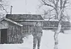Okänd deltagare i operationen Woodlark som genomfördes 1944-45, framför en byggnad i Burvattnet som ser ut likadan idag. Bild ur boken.