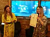 Skidprofilen Johanna Ojala, till vänster, var den som gav Moa Kårebrand hennes Mästarbrev från Sveriges Hantverksförbund under ceremonin på Teglet.