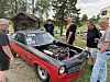 Här står ett gäng och imponeras av Mikael Handmarks Dragracingbil, en Chevrolet Vega utrustad med en 1000 hk Fordmotor som ger 0-100 på 1,2 sek och som klarar kvartsmilen på 8,20 då med toppfart på 270 km/h över mållinjen. Det åtgår ca 1l racingsoppa i sekunden på full gas.