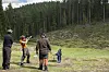 Linnea Bergström skjuter lerduvor med två av instruktörerna, vilka fick stort beröm av deltagarna.