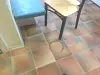 Ett märke på köksgolvet efter en het gryta. Hyresvärdarna skyller inte på hyresgästerna, det var tydligt att de varit vana vid helt andra typer av bostäder tidigare. Migrationsverket borde ha informerat dem, menar hyresvärdarna.